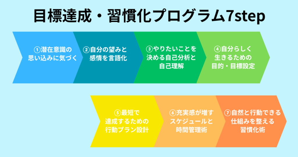 潜在意識、言語化、自己理解、目標設定、行動プラン設計、時間管理術、習慣化が総合的に学べます。
